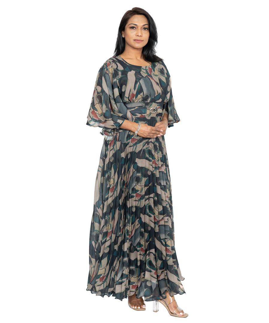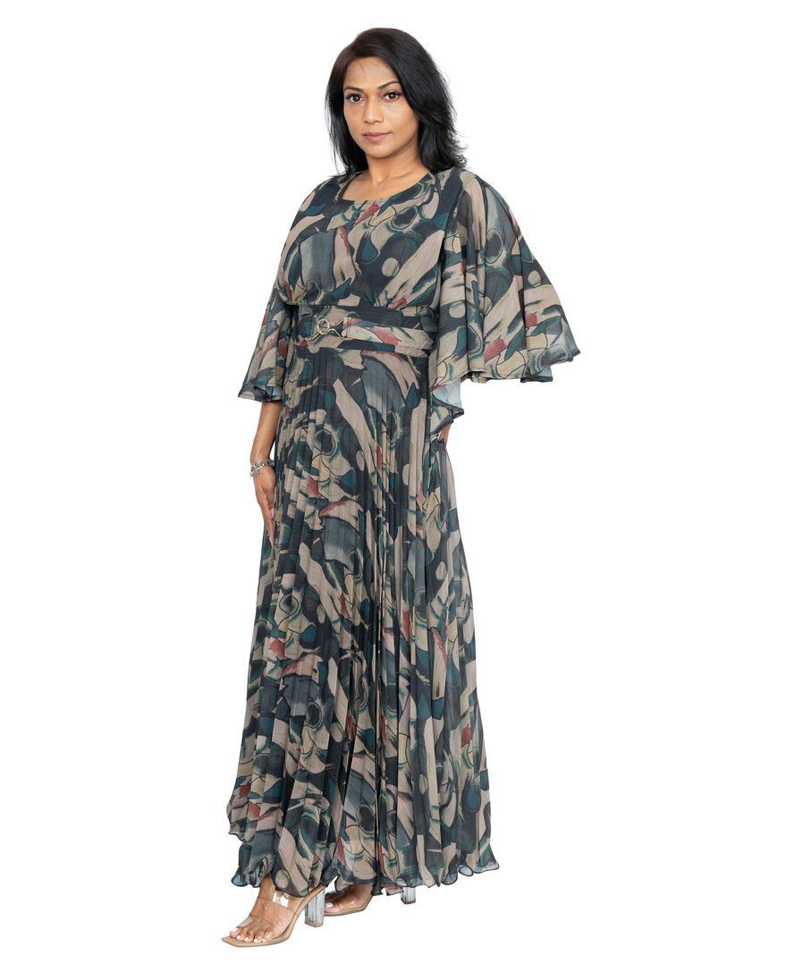 - Style: Pleated Flare | Pattern: Geometric Print | Fit: Relaxed Fit | Length: Ankle-Length | Neck: Round Neck | Sleeves: Butterfly Sleeves | Contains an elastic band at the waist