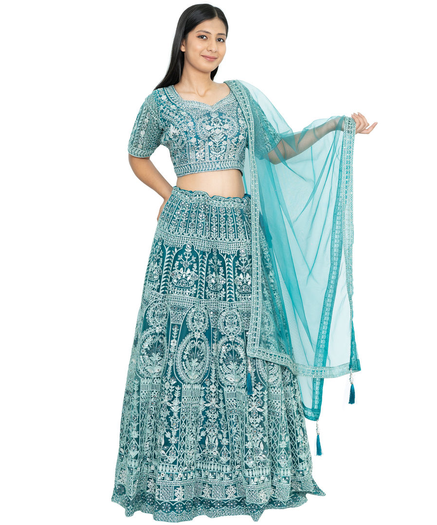 - Lehenga Fabric: Net; Blouse: Net; Dupatta Fabric: Net; Inner: Glossy Taffetta with Cancan(tulle)