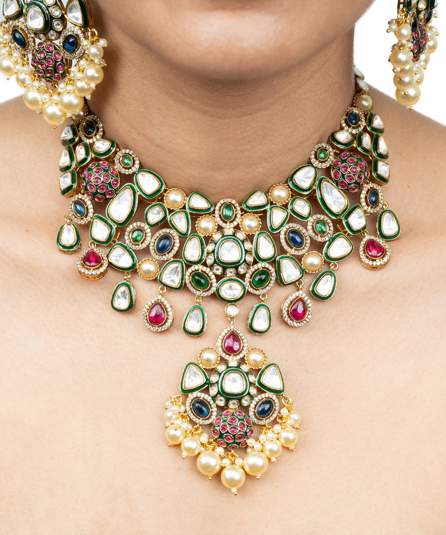 - MATERIAL: Traditional Kundan Jewellery Set / Necklace Set For Women Made from High Quality Hand Picked Kundan Stone and Pearls. Made of long lasting alloy metal, embellished with good quality faux stones, kundan look and faux pearls hangings. Hand finished.