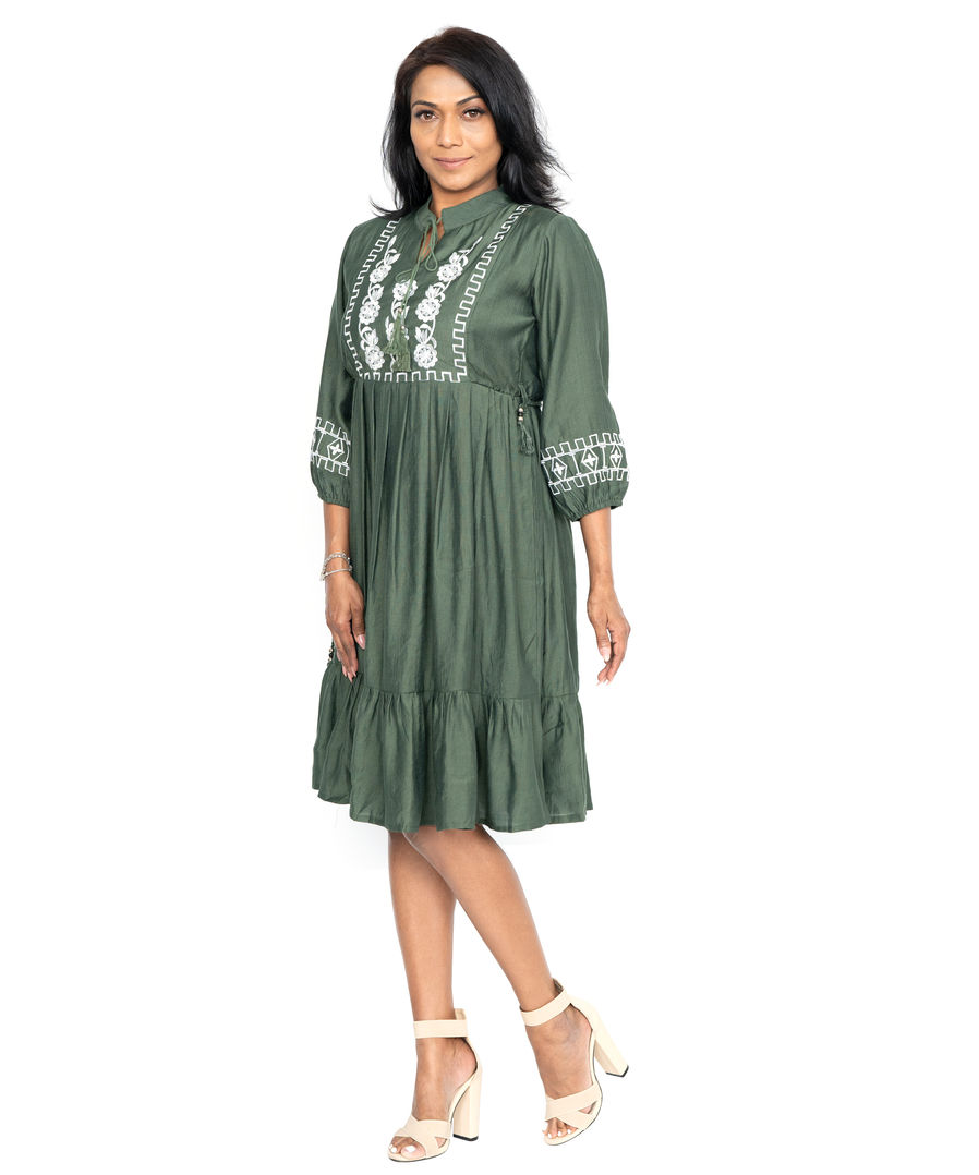 - Style: Embroidered | Pattern: Solid | Fit: Relaxed Fit | Length: Knee-Length | Neck: Band Collar Neck | Sleeves: 3/4 Sleeves| Contains an elastic band at the waist